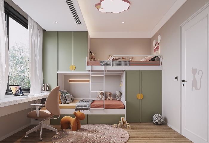 考慮足夠的睡眠空間:如果空間允許,可以放置兩張單人床,或者選擇上下鋪,為孩子們提供獨(dú)立的睡眠區(qū)域。同時,要確保床鋪的安全性,避免尖銳的邊角。