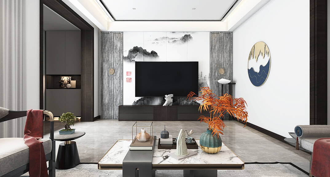 一幅水墨畫為基調(diào)的電視背景墻,映現(xiàn)自然景物與東方文化、審美的固有聯(lián)系,為空間賦予清新雅致的妝容;開門見山的呈現(xiàn)形式,更符合現(xiàn)代人的表達(dá)主張,融合中式文化精粹,演繹新東方主義家居設(shè)計(jì)的特色。