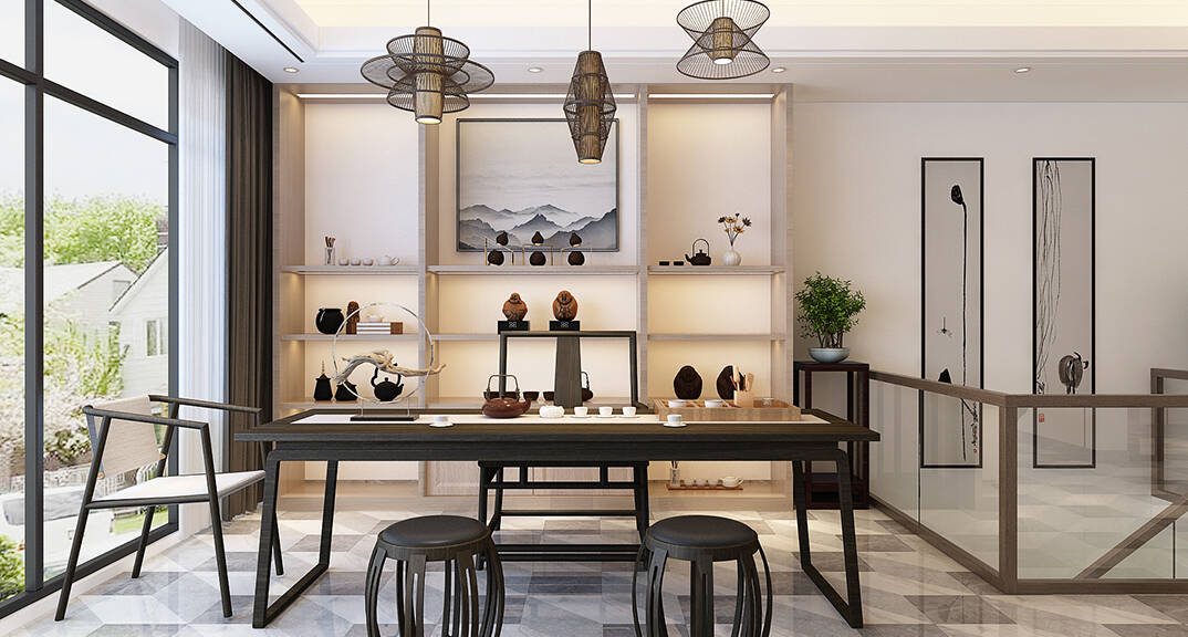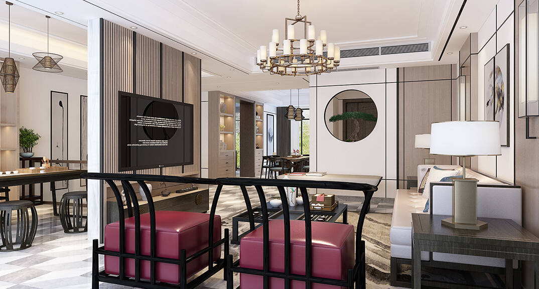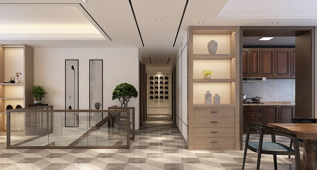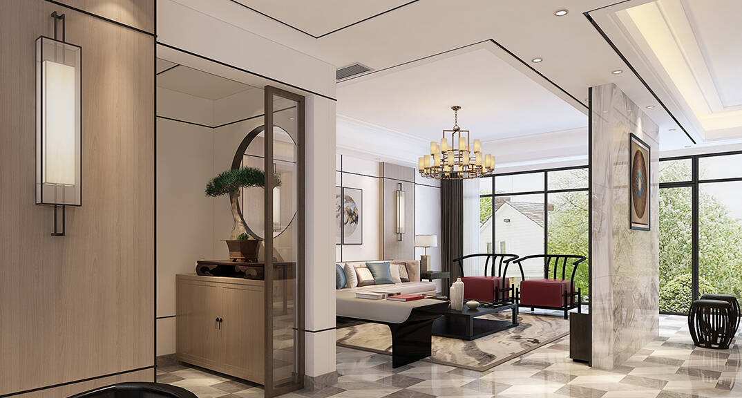 通過客廳、茶室優(yōu)化空間動線,門廳圓形隱蔽隔斷,天圓地方。地面采用了新中式黑灰白色三基色,體現(xiàn)中式文化中低調內斂的生活方式。