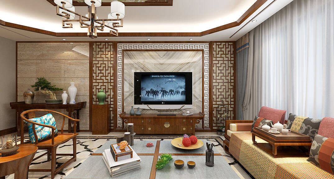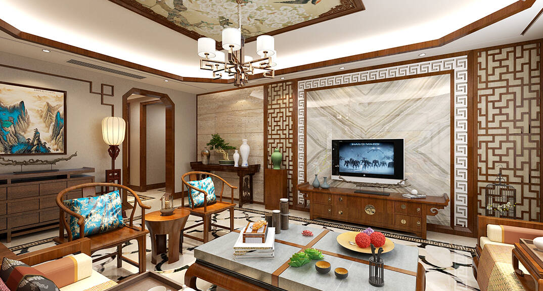 海怡半山216㎡三室二廳三衛(wèi)客廳電視新中式風(fēng)格裝修案例效果圖