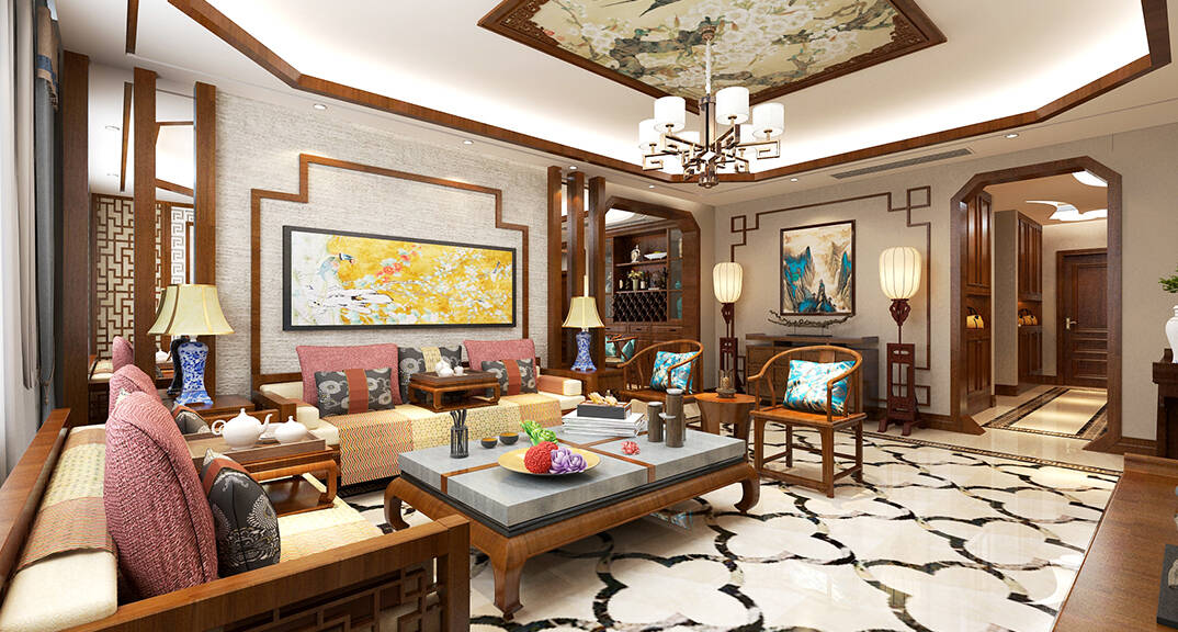 海怡半山216㎡三室二廳三衛(wèi)客廳新中式風(fēng)格裝修案例效果圖