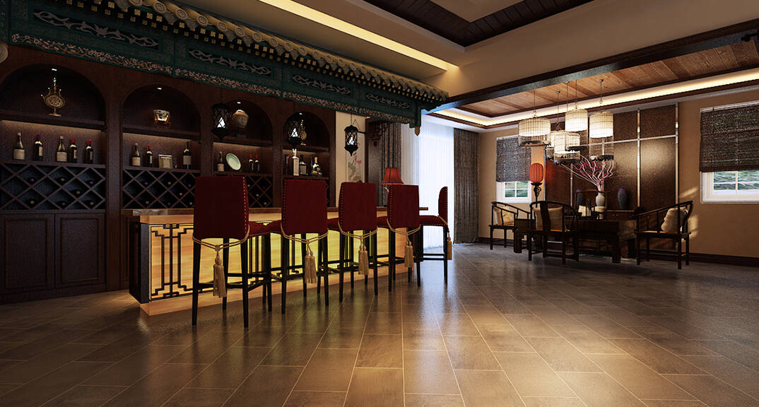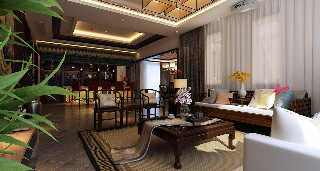 龍湖滟瀾海岸187㎡別墅客廳吧臺(tái)新中式風(fēng)格裝修案例效果圖