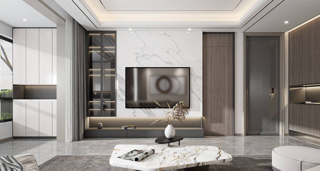 溫莎郡135㎡三室一廳客廳電視墻現(xiàn)代簡約風格裝修案例效果圖