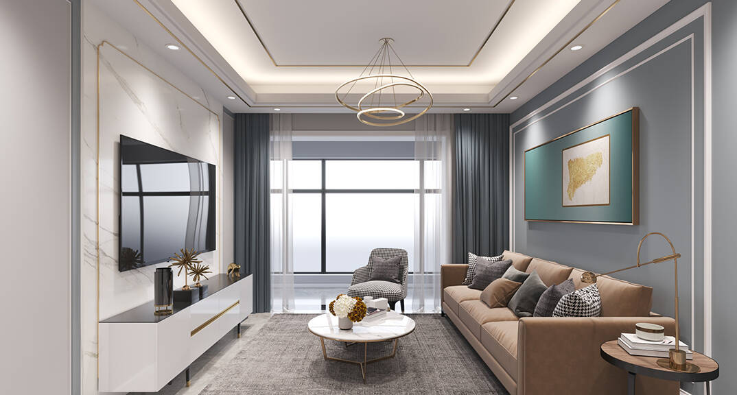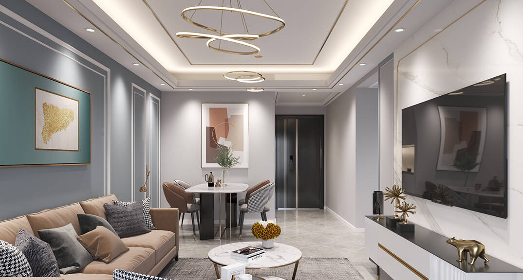 膠州機場公寓93㎡二室一廳客廳輕奢風(fēng)格裝修案例效果圖