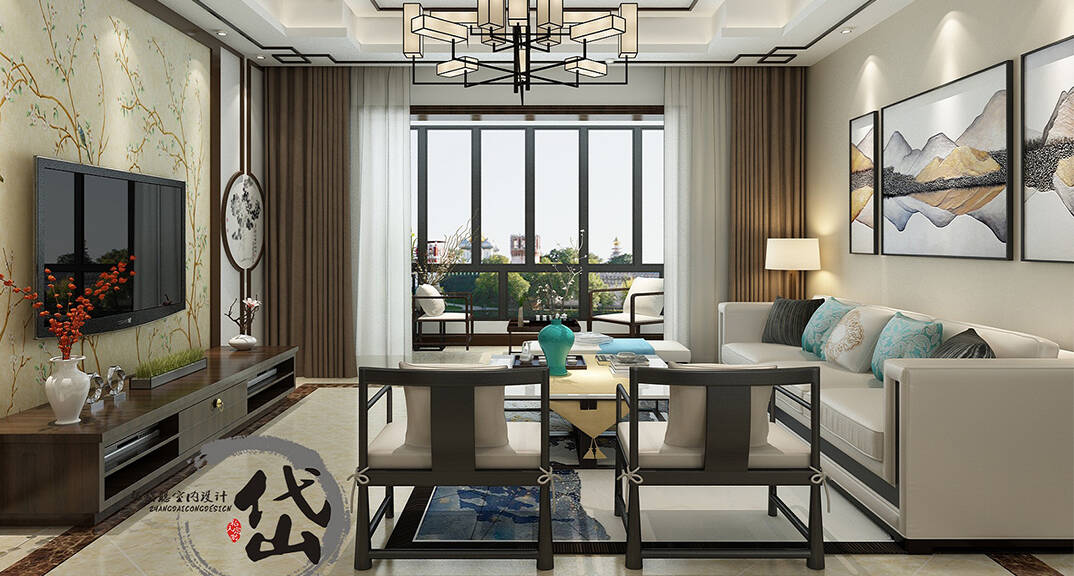 縵沙半島115㎡四室兩廳兩衛(wèi)客廳現(xiàn)代中式風(fēng)格裝修案例效果圖