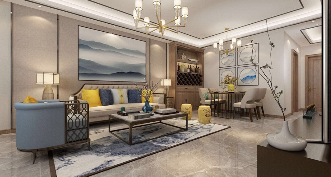 恩馬文景園144㎡二室一廳客餐廳沙發(fā)新中式風(fēng)格裝修效果圖