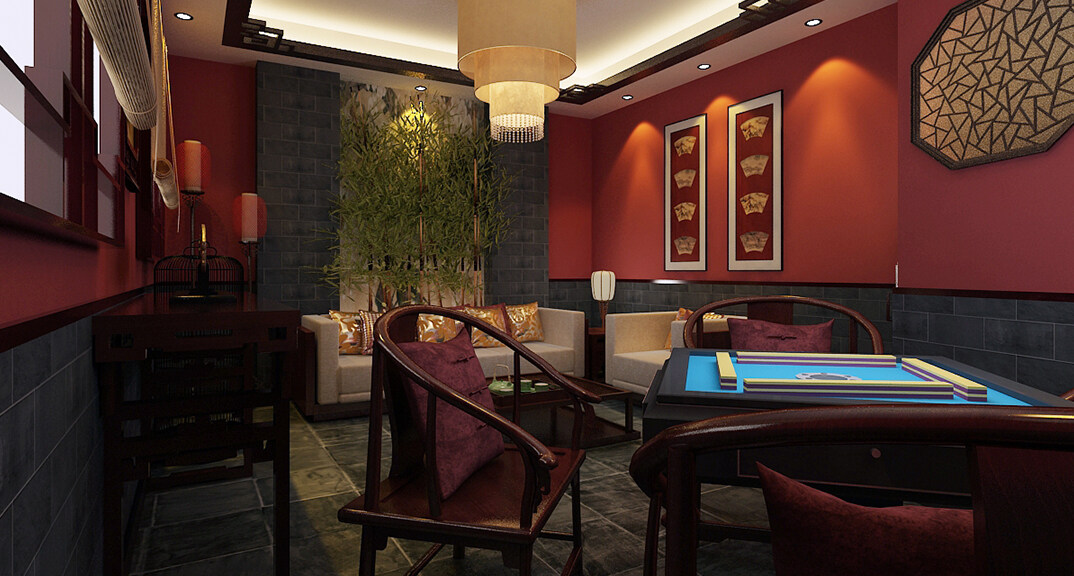 茶樓裝修200㎡茶室棋牌室中式風(fēng)格案例效果圖-冬青