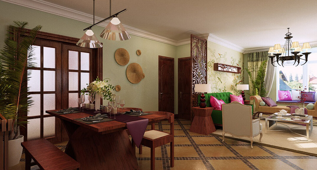 交運(yùn)山莊142㎡三室二廳客餐廳東南亞風(fēng)格裝修案例效果圖