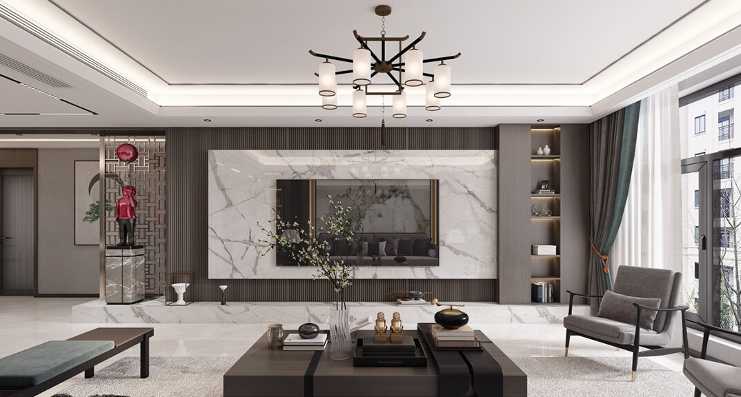 綠城·海棠印月166㎡三室二廳客廳電視新中式風(fēng)格裝修案例效果圖