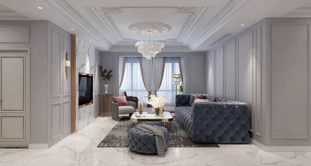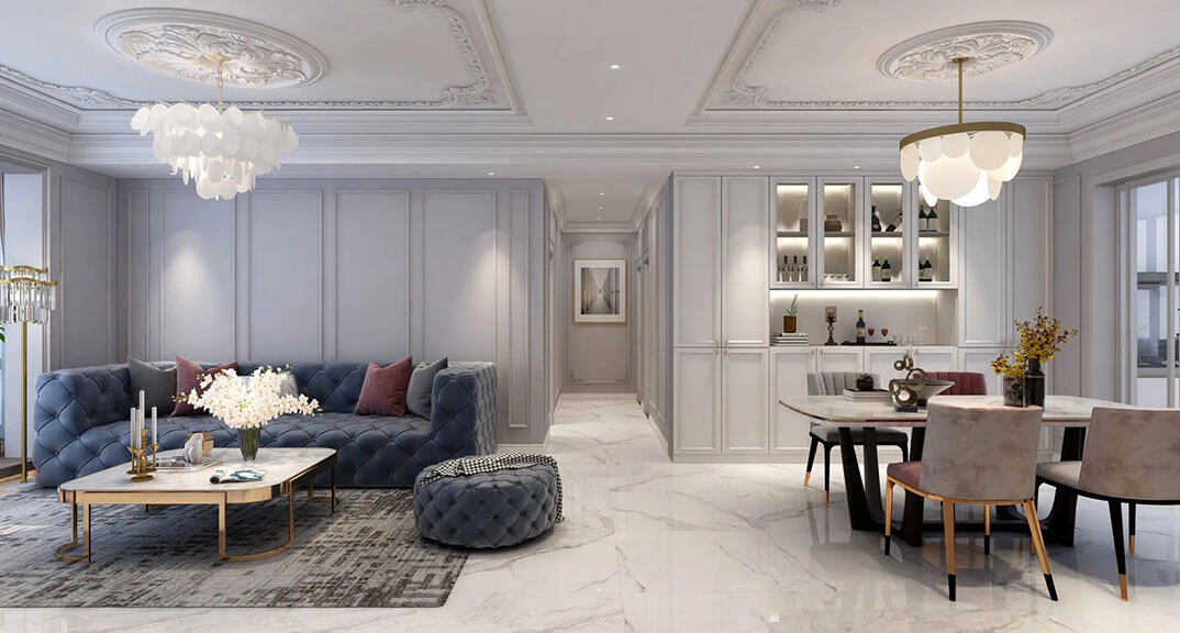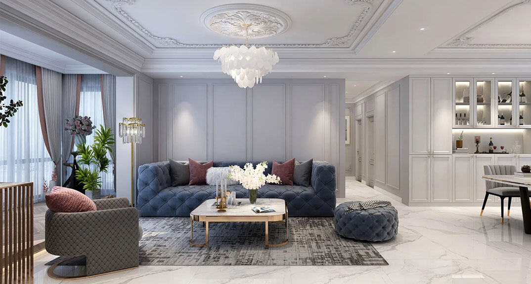 御苑小區(qū)137㎡三室二廳客廳法式輕奢風格裝修案例效果圖