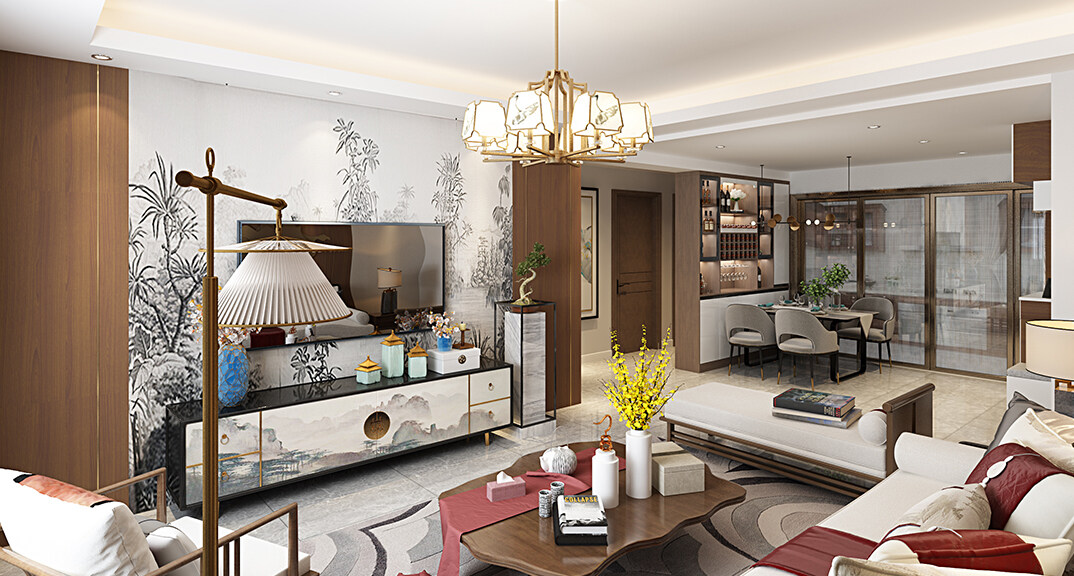 天寧首府128㎡三室兩廳客餐廳新中式風(fēng)格裝修案例效果圖
