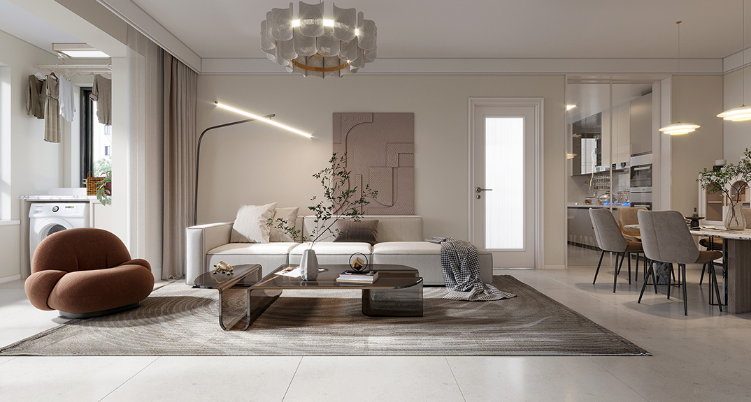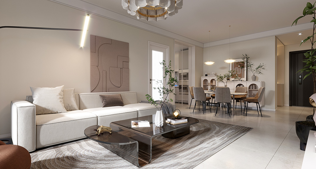 湖島世家128㎡三室兩廳客廳沙發(fā)餐廳現(xiàn)代簡(jiǎn)約風(fēng)格裝修案例效果圖.