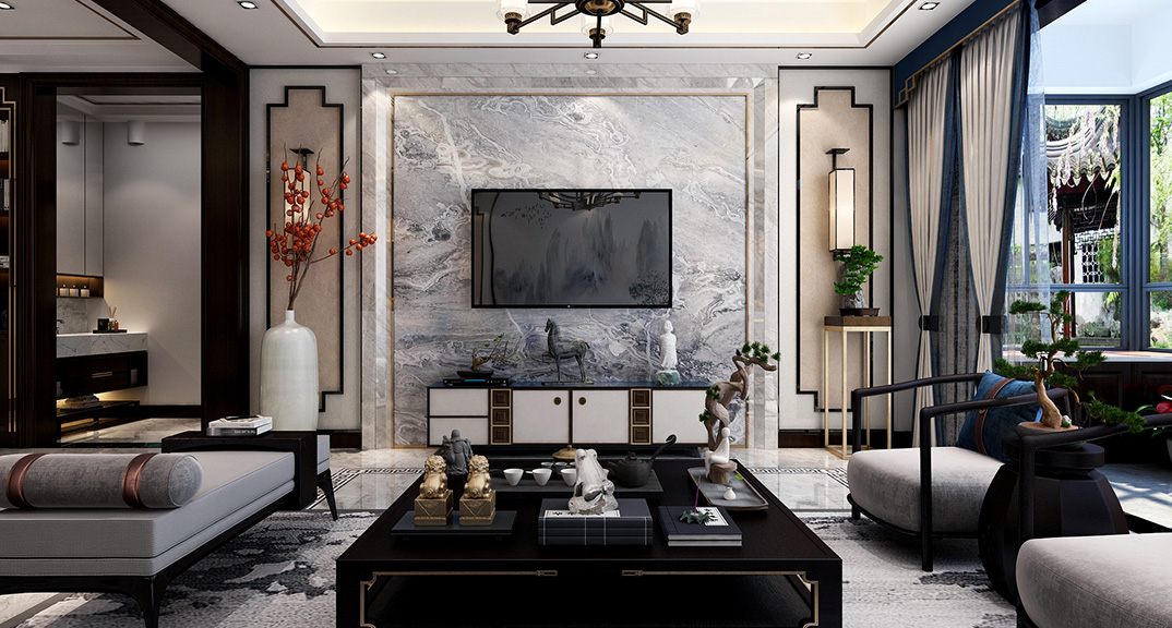 安泰名筑190㎡四室兩廳客廳電視新中式風(fēng)格裝修案例效果圖