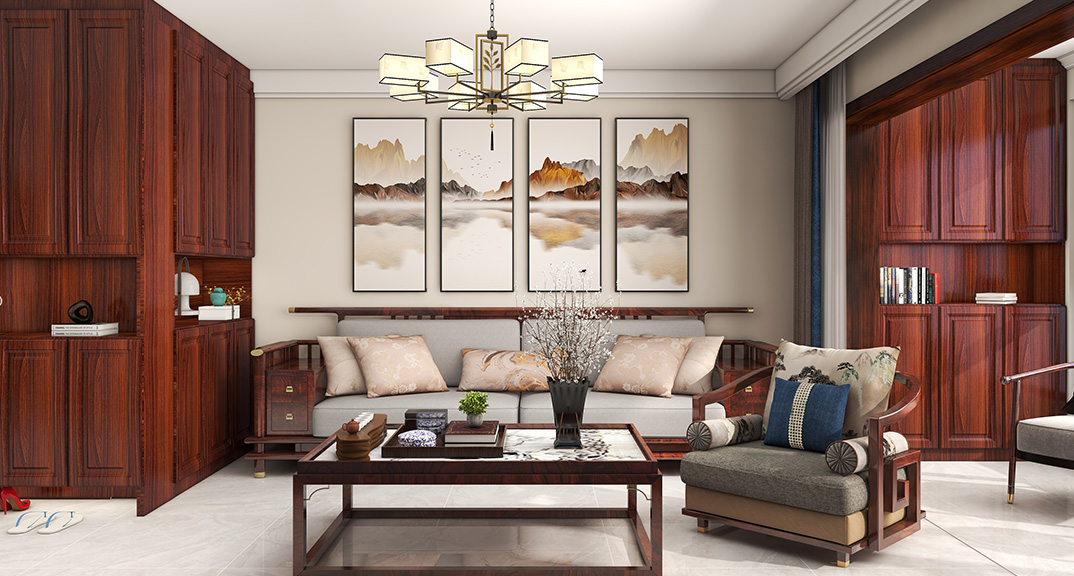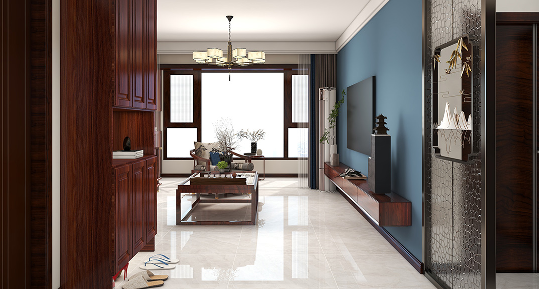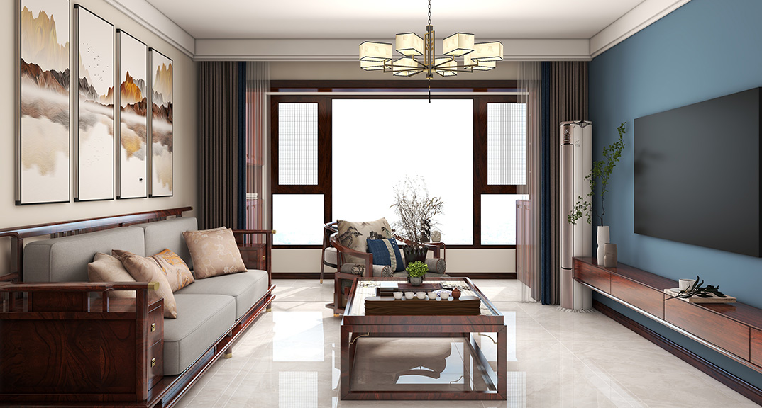 保利時代98㎡三室兩廳客廳中式風格戶型研發(fā)效果圖