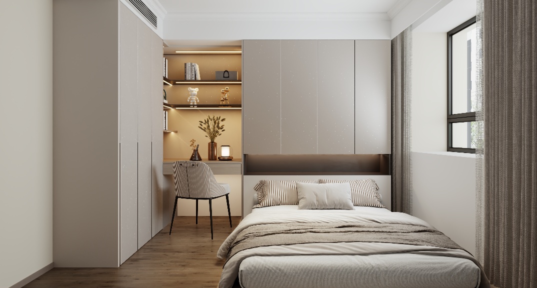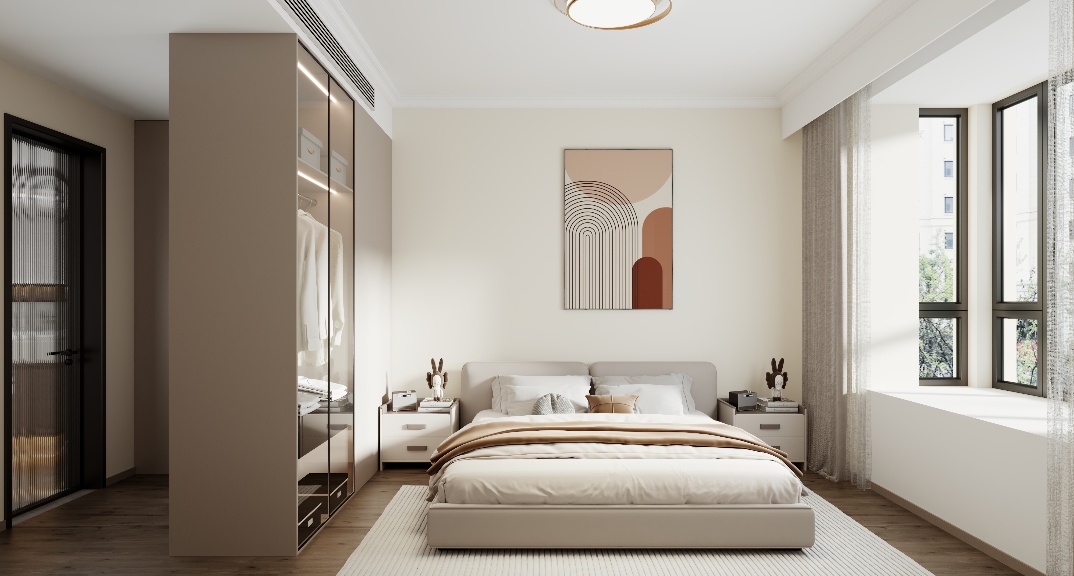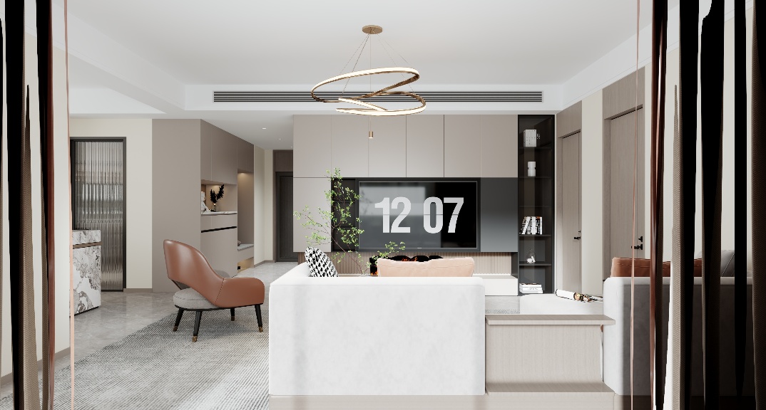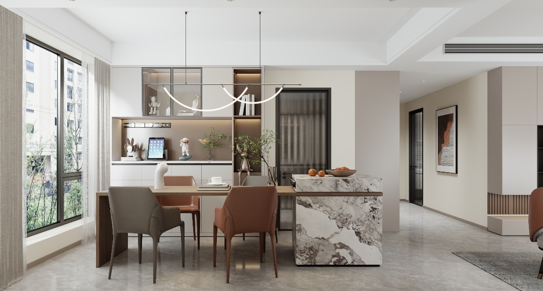 餐廳用六人桌+倒臺一體既滿足了多人就餐問題又能實現(xiàn)冰吧等品質(zhì)的提升,餐廳簡潔時尚,槍灰色色的線性燈吸引著眼球,與金屬餐廳酒柜呼應,整體色彩搭配和諧而充滿美感。客廳做滿墻電視柜設(shè)計既滿足了展示品等小物品的儲藏又不影響觀影效果。主臥室做L型開放式衣帽間一點避免衛(wèi)生間門正對床的弊端,一點拿去衣服比較方便,臥室進門還能實現(xiàn)端景美觀又實用。兒童房用地臺床結(jié)合床頭衣柜一體化完美體現(xiàn),書桌結(jié)合玩具柜合理利用空間,活動空間也有空余。衛(wèi)生間玻璃隔斷保證了空間的通透明亮,還能防止水分到干區(qū),沐浴區(qū)墻上做壁龕,收納洗浴用品正合適。主衛(wèi)采用了連續(xù)性,相同的空間形成一個較大的視覺縱深,層次更豐富,具有更強的流動性。