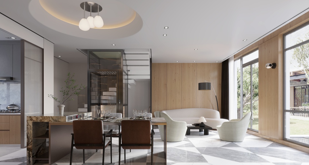 一層為開(kāi)放式客餐廚空間。客廳采用無(wú)主燈設(shè)計(jì),搭配深色皮質(zhì)沙發(fā)和金屬質(zhì)感茶幾,營(yíng)造簡(jiǎn)約時(shí)尚的氛圍。餐廳與廚房相連,方便日常用餐和家庭聚會(huì)。