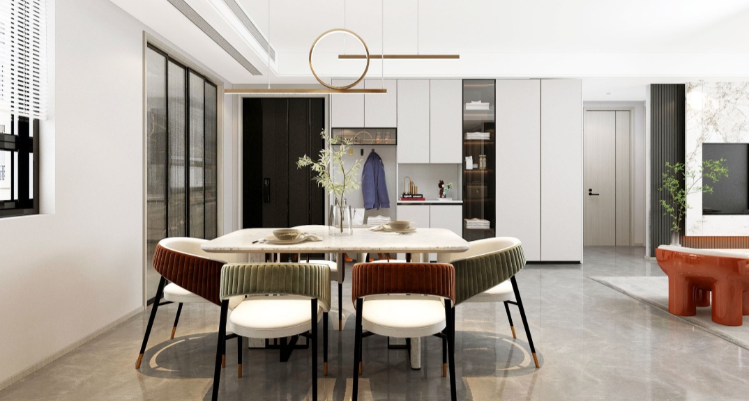 沒做無主燈,全屋簡單的雙眼皮吊頂墻面刷乳膠漆;餐廳選擇了雙頭吊燈餐廳不大,風鈴的造型,讓整個公區(qū)充滿了氛圍感!餐邊柜柜門和背景墻木飾面選擇了同色:子午灰,真皮沙發(fā)和餐廳吊燈黑色相呼應潘多拉的巖板與餐桌桌面花紋同款。
